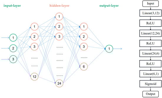For the selection of the activation function, the ReLU function that enables faster network training was selected as the activation function of hidden-layers, while the output of the output-layer is essentially a binary problem; therefore, the Sigmoid function, which is more suitable for the binary problem, was selected as the activation function of the output-layer. Since the DL-Train dataset features are clearly distributed, after experimental verification, the Stochastic Gradient Descent (SGD) was selected as the optimization method and the BinaryCrossEntropyLoss (BCELoss) function was selected as the loss function.