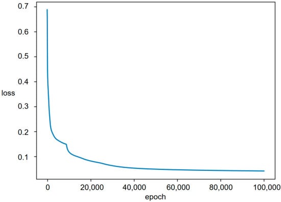 It is worth noting that since the DL-Train dataset actually contains all the working states of the dual-manipulator system used in this paper, it is unnecessary to consider the overfitting problem. As long as the DLNet can learn the DL-Train dataset well, it can judge all working states of the dual-manipulator system. Model training proceeds until the loss value converges, and the loss changes in the training process are shown in Figure 13. In this paper, accuracy was not an important indicator for evaluating the DLNet training results. We will select a threshold in the following part and process the network output to achieve 100% accuracy in judging no self-collision working states.