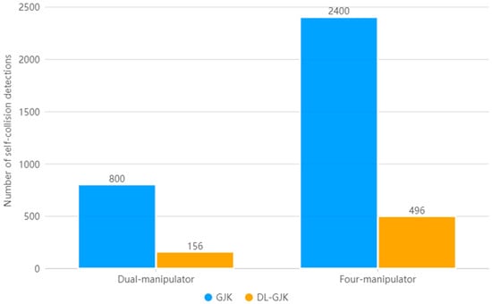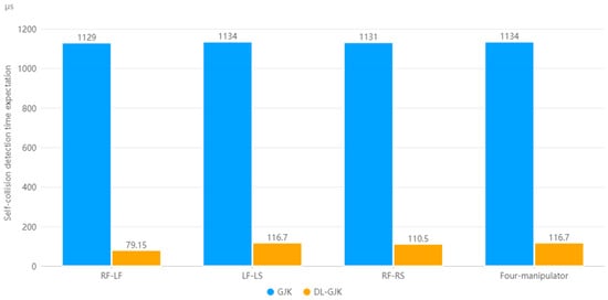 Since the collision detection of each group of dual-manipulator systems is calculated in parallel in the robot control system, as 39.81 μs, the maximum values of E(TDLGJK), E(TDLGJK)(RF-RS), and E(TDLGJK)(LF-LS) are taken as the time expectation of the DLGJK algorithm single detection for the four-manipulator system. As shown in Figure 17, compared to that when using the GJK algorithm globally, using the DLGJK algorithm can significantly reduce the single-detection time expectation, improve the detection efficiency, and effectively reduce the number of times calling the GJK algorithm.