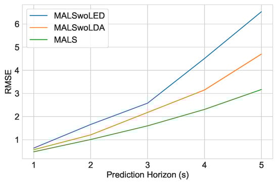 The results in Table 1 compare the above three models with our proposed architecture MALS. The improvement score is based on the mean of the difference in RMSE over the 5 s of the prediction horizon. First, it can be observed that adding the SMHA layer improved the model performance by 39.6%. This shows that the significance of the SMHA layer in extracting the social context of the traffic scenario via the graph is crucial to the prediction and is thus a vital addition to our model. Additionally, the TMHA layer stands as even more important, with an improvement of almost 50% by adding the layer. This confirms that, in addition to the social context, more importantly, the prediction is mainly based on the historical trajectories and self-attention to the historical trajectories which our proposed model is proficient in extracting via the TMHA layer. Encoding the memory information also serves as important according to our ablative results. The LSTM encoder, encoding the hidden memory information improves the model performance by 23.5%. We can also infer that part of this improvement also comes from improving the accumulative errors caused by the transformer-based STMHA encoder if no LSTM encoder is used to subsequently extract the hidden memory information. Figure 5 illustrates the RMSE values of the three experiments and their corresponding improvement.