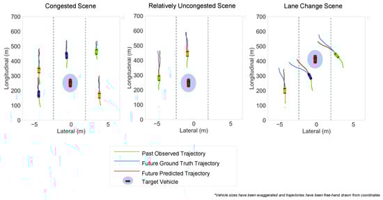Moreover, most studies related to highway future trajectory prediction have mainly adopted the popular NGSIM dataset [] to evaluate their performance. The NGSIM dataset was mainly collected to satisfy the need for data with explicit microscopic traffic flow and car-following information, for advancing traffic flow theory []. However, the NGSIM dataset was discovered to be extremely noisy in the literature by [,,]. Various efforts have been made to smooth out the noise such as low pass filter, interpolation, etc. by []. Ref. [] demonstrated that despite these efforts, the problem still persists and training on the NGSIM dataset thus has the potential possibility of resulting in a model with overfitted parameters, making it unfeasible to be deployed for practical application.