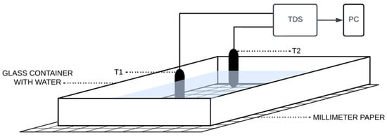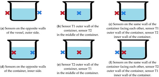 The experiment was divided into three parts in accordance with each hypothesis. In the first part, the effect of the arrangement (position) of the sensors in the thermodynamic system on the output response of the TDS was investigated. The experimental setup for the measurements with thermodynamic sensors and the basic measurement procedure are described in [,]. A pilot experiment was performed with different positions of the thermodynamic sensors relative to the measuring vessel as shown in Figure 1.