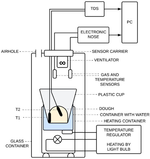 The monitoring of the fermentation process by the TDS was carried out in the configuration shown in Figure 3. A 0.2 L container with fermented dough is placed in a water bath whose temperature is controlled by a temperature controller. A 12V/5W bulb is used as a heating element, which is placed in a metal container adapted as a holder for the water bath. The whole system is housed in a larger glass container which separates it and protects it from the surrounding environment. A sensor carrier is attached to the neck of the glass container. On this carrier are placed not only the gas sensors of the electronic nose, but also the sensors of the thermodynamic system. These sensors are inserted into the fermenting dough. The output signals from the e-nose and the TDS are recorded by a computer, where they are then further processed.