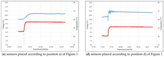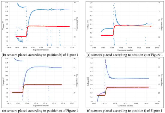 The pilot experiment, which focused on the sensor arrangement of the thermodynamic system, showed a significant dependence of the maximum output signal on the location of these sensors in the thermodynamic system. Figure 4 shows the variation of the output signal according to the different configurations (positions of the sensors in the system) shown in Figure 1. The blue curve in Figure 1 shows the output signal from the TDS while the red curve represents water temperature which is stabilized at a certain value according to the calorimetric Equation (1).
