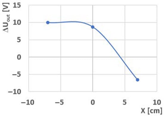 After the basic signal processing (shifting the start of the measurement to the point t0 = 0 s and U0 = 8 V), the direction and maximum of the first signal waves were monitored. It is assumed that after the addition of hot water (temperature pulse) in the middle of the direct junction (position X2) between the technologically identically manufactured sensors, both sensors should be affected equally and the resulting change in output voltage should be 0 V. However, the orange curve for position X2 shows a change that demonstrates that the sensors do not have the same parameters, and the point at which there is no change in output voltage is shifted to sensor TDS2. This is illustrated by the graph in Figure 6, which shows the dependence of the magnitude of the peak on the position of the hot water addition. For the output signal at position X1, the maximum value of the Uout signal is limited by the measurement system. It is assumed that with a different system sensitivity and without this limitation, the curve in the graph in Figure 6 would be more linear.