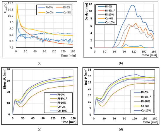 For the signals from the TDS, the start of the measurements (time and output voltage at the point when the dough was inserted into the system) was shifted to t0 = 0 s and Uout U0 = 8 V. Unless otherwise specified, each test was performed with at least three repetitions. To be consistent with the measurements from the professional reofermentometer, the measurement time was extended to 3 h.