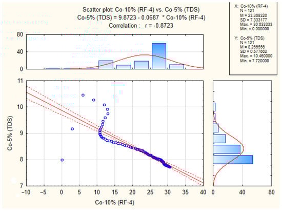 The correlation of the output signals between the different systems was determined using Pearson’s correlation coefficient, which is presented in Table 3 for the comparison of the different types of gluten-free dough. Since the Co-10% flour type was not measured on the TDS, this flour type measured on the RF-4 was compared to the Co-5% type measured on the TDS. All calculated coefficients are statistically significant at the significance level of p < 0.05. The table shows a low correlation between the output curves from the TDS and the dough development curve from RF-4, however, when compared to the gas release curve, the Pearson correlation coefficient rises to above 0.87. An example of the result from STATISTICA CZ version 12 (StatSoft, Inc., USA) is shown in Figure 8. It is clear from the result that if the initial values (initial wave) of the gas release curve are not taken into account, the correlation coefficient would be even higher.