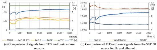 Because of the comparison of the nature (shape) of the individual output signals with each other, it was not necessary to determine the exact concentrations of the individual gases. Therefore, for simplicity, the output signals from the electronic nose sensors are given on a relative scale given by the output signal from the internal 10-bit A/D converter. In the case of the MQ-3, MQ-8 and MQ-135 sensors (Zhengzhou Winsen Electronics Technology Co., Ltd., Zhengzhou, China), the conversion is from voltage level Uout = 0–5 V to digital level d = 0–1023). In the case of the SGP30 sensor (Sensirion AG, Staefa ZH, Switzerland), the calculated TVOC signal is given in the range from 0 ppb to 60,000 ppb and the CO2eq signal in the range from 400 ppm to 60,000 ppm. Both signals are calculated directly in the sensor from the raw signals for ethanol and H2.