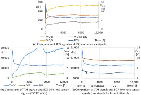A significant advantage of combining these systems was that the measurements could be made in a single instance and the individual signals could be accurately compared. The disadvantage was that the electronic nose uses a simple temperature controller, whose action is not detected by the gas sensors in the electronic nose but is responded to by the thermodynamic system. The whole system was tested on a sugar solution (70 g/L) with the addition of 0.5 g of dried yeast (Thymos, spol. s r.o., Veľká Lomnica, Slovakia). An example of the comparison of the output signals from the e-nose and TDS for this measurement is shown in Figure 9. The correlation coefficients for this example are given in Table 6. Since no change was detected in the TVOC and eCO2 signals throughout the measurement period, these signals could not be used for comparison and correlation coefficient calculation.