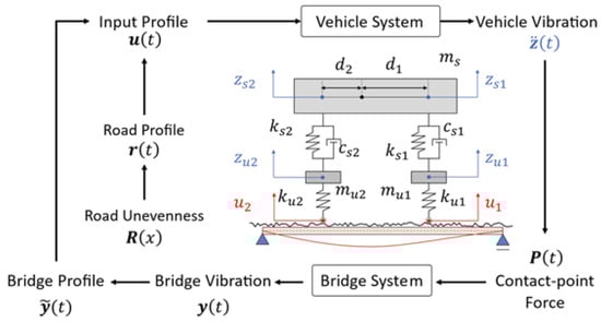 Figure 2 shows a conceptual diagram of the VBI system used in this study. A half-car model is adopted for the vehicle, and the bridge is a simple one-dimensional beam model that considers only bending. The half-car model considers four independent degrees of freedom: the translation and rotation of the car body and the translation of the half-car axle. As the VBI system is a non-linear system and the input/output of the vehicle is the output/input of the bridge, convergence calculation is required to reproduce the vehicle vibration. First, input displacement is given to the vehicle model to obtain the vehicle vibration, and the contact-point force calculated from the vehicle vibration is input to the bridge model to obtain the bridge vibration. The input displacement of the vehicle is updated from the obtained bridge vibration, and the vehicle vibration is calculated again. This process is repeated until the vehicle vibration converges.