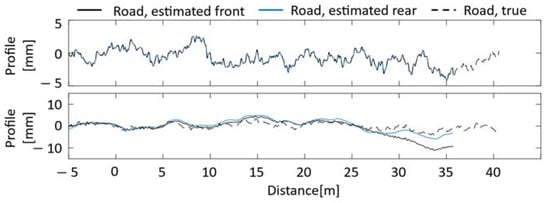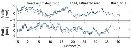 Subsequently, the Robbins–Monro algorithm [] dynamically estimates the variance–covariance matrix of the process noise and the observation noise . Correctly estimating the order of noise is important because it affects the practicality of Kalman filter-based road profile estimation. Here, and are positive real numbers smaller than one.