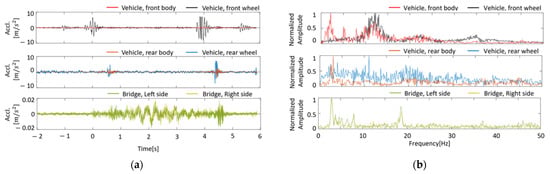 Vibration response of vehicle and bridge: (a) in time domain; (b) in frequency domain.