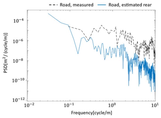 The results of the VBISI method run using the data measured in the field test are summarized in Figure 9 and Figure 10 and Table 4. Figure 9a shows the acceleration vibration of the bridge vibration estimated by the VBISI method, its FFT result, and the estimated road profile. In the frequency domain of Figure 6, a peak around 18 Hz can be observed for the bridge vibration. This peak could not be observed from the estimated bridge vibration, as shown in Figure 9a. Figure 9b shows the road profile estimated by the VBISI method. Large amplitudes can be seen around 0 m and 30 m of the estimated road unevenness. These amplitudes can be attributed to the expansion joint in front of and behind the bridge. The road unevenness estimated for the front and rear wheels show similar characteristics, but they did not match. Figure 10 compares the power spectral density function (PSD) of the VBISI-estimated and measured road unevenness. The estimated road unevenness was assessed at the vehicle’s front axle position. The road unevenness was measured using a road profiler. The estimated road unevenness is lower than the measured road unevenness. Table 5 summarizes the vehicle and mechanical bridge parameters estimated by the VBISI method. The correct values of the modal parameters for vehicles and bridges in a field test have yet to be discovered. Therefore, evaluating the parameters estimated by this method is a technical issue.