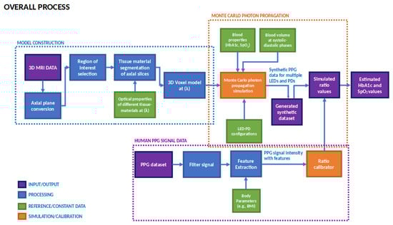 The overall process is segmented into three parts—model construction, Monte Carlo photon propagation simulation, and human PPG signal data processing. The model construction part contains the process of generating the parametric tissue model with the help of MR image data for the Monte Carlo simulation. Then, the Monte Carlo photon propagation simulation part contains the individual components of the simulation blocks. This simulator takes in the parametric model generated in the previous step and runs the photon propagation simulation to generate the optical models which can take the PPG signal as input to estimate the HbA1c values. Then, using the human PPG data, the optical models are evaluated. The preprocessing of the human data was described in the human PPG signal data blocks. The different blocks and elements depicted in this block diagram are discussed in detail in the following subsections.