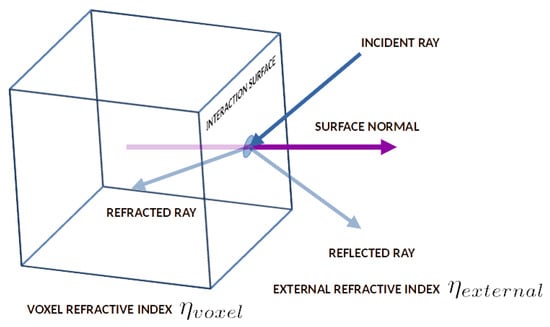 The Monte Carlo photon transport method described above depends on the position of the photon packet inside the tissue system. The tissues are considered as the axis-aligned cubes consisting of the cube centroid and the cube unit length in the global space. For each tissue boundary detection process, the current tissue material of the photon packet is tracked for changes. If the tissue material changes between any two steps, then the photon is considered to have crossed a tissue boundary. In this scenario, the photon movement is calculated inversely, and a ray casting is performed along the photon packet direction vector on the voxels of the new tissue material. Then, the intersected face of the voxel is computed along with the intersection point and the intersection plane normal in the global space. The photon is then transferred to the intersection point with the estimated photon absorption. From that point, the face normal and photon direction vector are used to calculate the refraction and reflection vectors. The reflectance parameter calculated from Schilick’s approximation is then used to randomly determine the final direction vector of the photon propagation, and the photon position and direction vectors are updated accordingly. Figure 2 shows the photon ray and voxel face interaction cases with the reflection and refraction direction vectors.