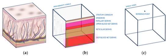 Conceptual illustrations of the (a) actual subdermal layers, (b) naive voxel generation method (a large number of voxels to faithfully replicate the actual effects of the dermal sublayers), and (c) proposed method of composite tissue (in a single voxel, the material properties are calculated during the runtime using the distance of the photon from the reference point(s)).