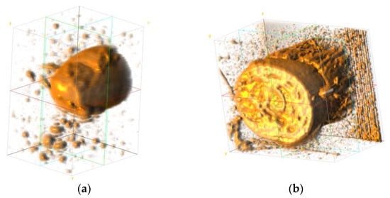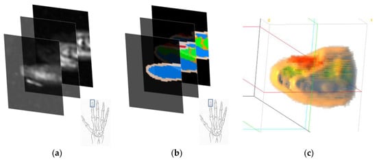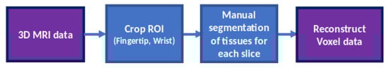 MR image data of the wrist were obtained from the study by Wang et al. []. The dataset contains MRI data of two subjects with 12 poses each. The scanner used in the original study obtained 1 mm thick sample slices with a 0.5 mm overlap. The data were then converted into 0.5 mm isovoxel images. Then, after obtaining the MR data, the images were spatially cropped to select only the region of interest. In our case, only pose 1 (neutral pose) of the male subject was selected for further analysis, since in our implementation, the deformation of the muscular and skeletal tissues does not play a significant role. The regions of interest were the fingertip section of the index finger (from the fingertip to the tip of the middle phalanx) and the wrist section (immediately following the carpals). Figure 4 shows the 3D representation of the two cropped regions from the raw MR data.