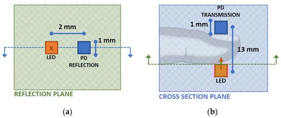 Light-emitting diode (LED) and the photodetector (PD) arrangements for the fingertip model (a) on the reflection plane with the blue dotted line and (b) on the fingertip cross-sectional plane with the green dotted line indicating the perpendicular planes. The perpendicular planes are indicated with dotted lines and blue-green colors (blue: cross section plane, green: reflection plane).