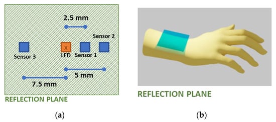 LED-PD arrangements for the wrist model. (a) LED-PD arrangement in the reflection plane, (b) physical location of the reflection plane for the wrist model.