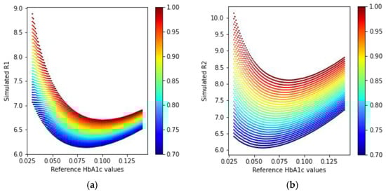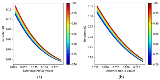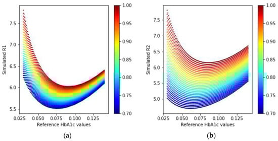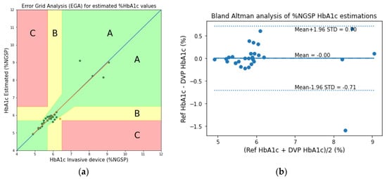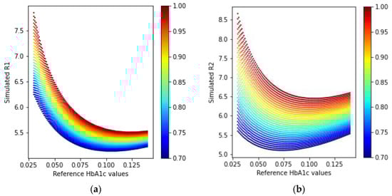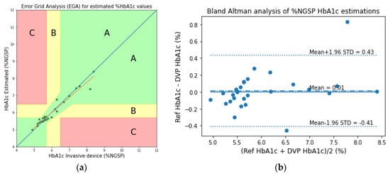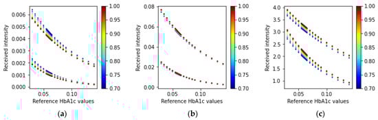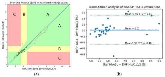 Another group of researchers classified mice models into diabetic, obese, and normal control groups, based on the measurement conditions associated with hyperglycemia []. Some other studies reported the classification into diabetic and non-diabetic statuses for subjects []. The HbA1c levels were also estimated using the acetone levels in the breath in another study []. We previously attempted to estimate the HbA1c levels by simple gray-box models derived from Beer–Lambert-based equations, using digital volume pulse waveforms []. Although our previous work shows promising results, it can produce erroneous estimations in extreme cases with too low or too high amounts of hematocrit and very low blood oxygenation (SpO2) values.