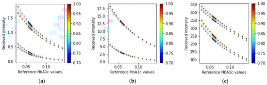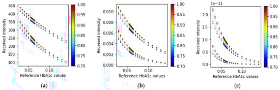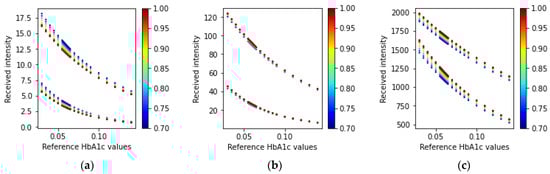 Following the configuration of the light sources, the simulations were performed for various HbA1c and SpO2 values with the systolic and diastolic phases at three different wavelengths. The SpO2 values considered for this study were 0.7, 0.75, 0.8, 0.85, 0.9, 0.95, 0.96, 0.97, 0.98, 0.99, and 1. Similarly, the HbA1c values considered were 0.03, 0.035, 0.04, 0.045, 0.05, 0.055, 0.056, 0.057, 0.058, 0.059, 0.06, 0.061, 0.062, 0.063, 0.064, 0.065, 0.07, 0.075, 0.08, 0.085, 0.09, 0.10, 0.11, 0.12, 0.13, and 0.14. A higher importance was given to the HbA1c and SpO2 values that are more common (SpO2 from 95% to 100%) or have a clinical importance (HbA1c values from 5.5% to 6.5%).