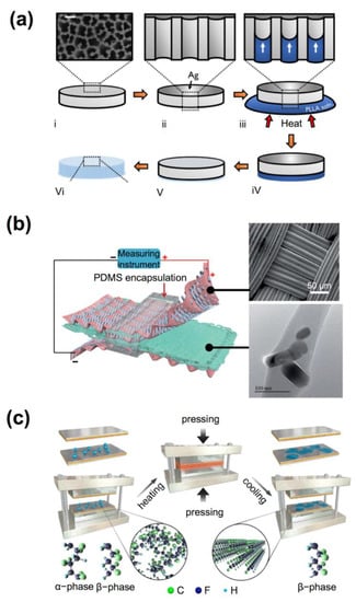 (a) A schematic of the temperature controlled capillary infiltration process used to grow the PLLA nanowires []; (b) schematic diagram of ZnO-nanoparticle-reinforced PVDF nanofibers by electrospinning []; (c) a typical hot-pressing method adopted to fabricate ultrathin PVDF nanoflakes [].