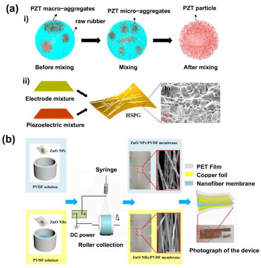 (a) Fabrication process and characterizations of the high performance PZT-based stretchable piezoelectric composite []; (b) schematic illustration of ZnO/PVDF nanocomposite fibrous membrane [].