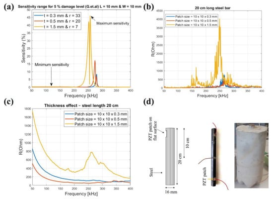 (a) Sensitivity levels with respect to thickness variations using Giurgiutiu’s model; (b) the real part of impedance in free air over frequency ranges from 50 to 400 kHz related to different patch size; (c) the real part of the impedance in reinforced concrete with varying patch thickness; (d) diagram of steel dimensions, actual steel, and actual concrete used in the experiments [].