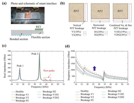 (a) Photo and schematic of smart interface with PZT transducer; (b) schematic of PZT breakage; (c,d) numerical EMI responses under PZT debonding defects, PZT breakage, and interface debonding defect [].