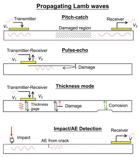 Guided wave-propagation-based SHM is most widely used for damage detection in metallic and composite structures, existing in aircraft, pressure vessels, missiles, pipelines, and steel bridges []. Piezoelectric components can be utilized as actuators or sensors in the guided wave-propagation-based SHM. According to the functionality of piezoelectric sensors, there are mainly four modes of the guided wave propagation, including pitch–catch mode, pulse–echo mode, thickness mode, and impact detection mode, as shown in Figure 7 []. Taking the typical pitch–catch mode as an example, a pair of piezoelectric transducers are attached on the plate-like structures. Firstly, ultrasonic guided waves are induced by the piezo-actuator attached to the surface of a flat plate-like structure. Secondly, ultrasonic disturbances occur and propagate radially to the around in the structure. Finally, the piezo-sensor around receives the electric charge signal, owing to the induced mechanical strains and output voltage signals (sensing waveform). While there is an even damage existing in the structure, the guided wave (such as Lamb wave) would incur dispersion and energy would attenuate during the propagation in the pitch–catch mode, pulse–echo mode, and thickness mode. The thickness mode can be used for the detection of corrosion thickness loss. In the impact detection mode, the piezoelectric sensors would receive a signal of acoustic guided wave, while impact events on the structure and advancing cracks occur. This is specific in acoustic emission, which will be introduced in detail in Section 4.3.