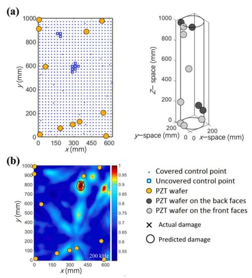 Apart from the transducers themselves, transducer/sensor network optimization offers an opportunity to obtain robust and low-cost active SHM systems. Two reviews had focused on the sensor networks for SHM by Ostachowicz [] and Mustapha []. Sensor networks should be well-designed as they affect the SHM system integration, system performance, and accuracy of assessment. In the sensor network, deciding the number and locations of the sensors are the primary work for accurate damage detection and localization, then followed by the data transmission, data processing, etc. Many researchers have focused on determining the minimum number of piezoelectric transducers and achieving full or high coverage of damage monitoring by developing algorithms. A lot of algorithms, such as iterative optimization, combinatorial optimization, genetic algorithms (GA), and artificial neural network (ANN) techniques, have been developed to optimize distribution of sensors []. Recently, Ismail et al. proposed an approach of transforming any complex or closed structure surface, and then used a genetic algorithm to optimize the deployment of piezoelectric sensors []. The coverage of the optimized sensor network increases from 85 to 99% for a pipe-like structure, as shown in Figure 8a. Experimental validation was performed on a circular section (pipe) and the artificial damage can be accurately located within 18 mm from the actual location in Figure 8b. They also developed a similar model for sensor network optimization based on genetic algorithms, which was further validated on a large cargo door of an A330 airplane [].