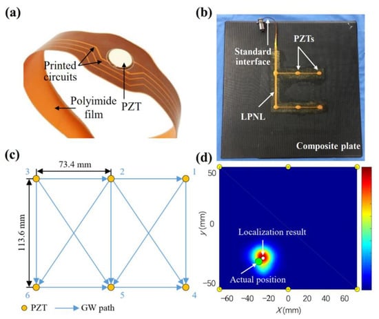 In addition to the optimization of sensor network for global monitoring, there are some interesting works on the topic of large area monitoring. Nonlinear lamb waves have attracted intensive attentions to be used for contact-type damages (e.g., disbands, delamination, and micro-crack) because of its high sensitivity to these damages [,]. Ju et al. proposed a nonlinear ultrasonic testing method for large-area monitoring of practical structures with arbitrary complexity using multi-mode guided waves []. When the multi-mode guided waves diffusely propagate through the structure, all available guided wave modes are automatically down-selected by the medium through attenuation or dispersion and the remaining modes efficiently transfer energy (for example, to their second harmonic modes) after encountering the micro-cracks. This method assures the success in detecting the crack that is close to the middle of actuator and sensor with a distance of 0.95 m. When large-scale monitoring is demanded, smart sensor networks are proposed to overcome the problems regarding large number of sensors, the complex cable, and placement efficiency. Many investigators developed the smart sensor networks combing the piezoelectric materials and flexible circuit technology [,,]. The smart sensor networks have the advantages of light weight, high placement efficiency, and being suitable for complex structural forms. Ren et al. developed a large-scale PZT network layer (LPNL) design method based on FPC technology and one of the LPNLs connecting 37 PZT transducers has a dimension of 565 mm × 500 mm []. A small section of LPNL is shown in Figure 9a and one of the LPNL network is attached to the composite plate with the detail placement in Figure 9b,c. The maximum localization error of its damage diagnosis using this LPNL network is 0.41 cm, as shown in Figure 9d.