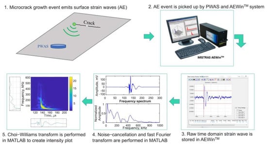 Flowchart of acoustic emission signal processing from microcrack growth event to the time–frequency intensity plot of Choi–Williams transform [].
