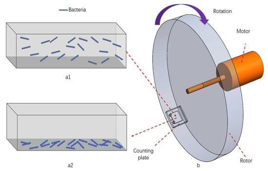 Schematic diagram of centrifugation effect. (a1) Before centrifugation: bacteria floating in the bacteria solution in the inner chamber of the counting plate; (a2) after centrifugation: bacteria settling on the bottom surface of the counting plate; (b) centrifuge: the motor drives the rotor to rotate and the counting plate is located at the edge of the rotor.