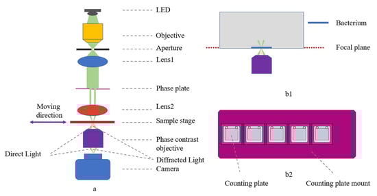 Phase contrast microscope overview. (a) Optical layout with ray tracing: direct light in green, diffracted light in orange; (b1) bacteria at the focal plane of the microscope after centrifugation; (b2) counting plate mount with five holes, allowing simultaneous detection of bacterial growth at five different concentrations of antibiotics.