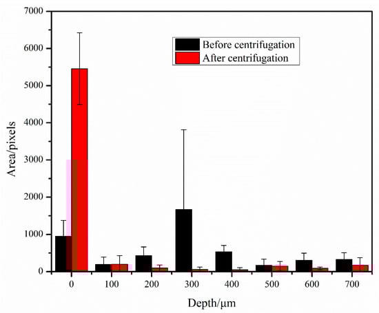 Bacterial area at different depth layers before and after centrifugation.