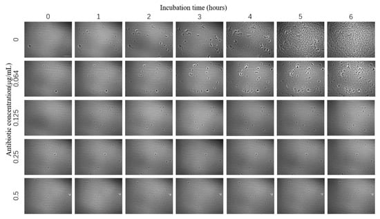 The images of E. coli growth over time at different tigecycline concentrations were obtained according to the above scheme (Figure 4). As we can see from the images, with the increase of time, E. coli appeared to grow significantly without antibiotics and at 0.064 μg/mL concentration, specifically in terms of an increase in number and size; a small amount of bacteria grew in the bacteria solution at 0.125 μg/mL antibiotic concentration; while at 0.25 μg/mL and above, the growth of E. coli was significantly inhibited and basically did not grow again.