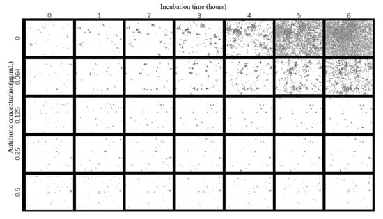 After acquiring the phase contrast image of E. coli growing under the effect of different concentrations of tigecycline over time, the E. coli was segmented by image processing. As shown in Figure 5, the E. coli phase contrast image was segmented by background subtraction, Gaussian filtering and adaptive thresholding, and it can be seen that the bacteria and the background are clearly separated, where the black is the bacteria and the white is the background. After image processing, the bacteria and background can be effectively segmented, which provides the conditions for a subsequent calculation of bacterial growth rate.