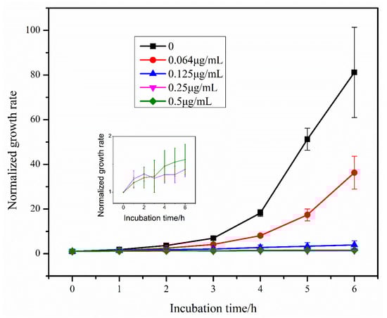 Using the segmented image in 3.3, the E. coli area was obtained, the growth rate of E. coli was calculated according to Equation (1) and the growth rate change curve of E. coli was plotted (Figure 6). From the figure, it can be seen that the growth rate of E. coli gradually increased in the absence of antibiotics and low concentration of antibiotics, and gradually showed exponential growth. With the increase of antibiotic concentration, the growth rate increase of E. coli became smaller or even remained unchanged, indicating that the growth of E. coli was gradually inhibited with the increase of antibiotic concentration. The lowest antibiotic concentration that can significantly inhibit the growth of microorganisms is MIC [8], and it can be seen from the growth rate curve that bacterial growth is inhibited at 0.125, 0.25 and 0.5 μg/mL concentrations. Therefore, among the five concentrations we selected, the MIC is 0.125 μg/mL.