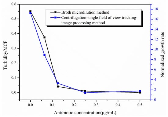 Therefore, we established a complete method on rapid AST of bacteria by the above means, i.e., centrifugation-single field of view tracking-image processing. Using this method, we can obtain the growth of bacteria over time in the presence of different concentrations of antibiotics and thus obtain the MIC of antibiotics.