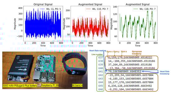 (Top) From left to right: Raw signal from the self-collected HARB dataset. An augmented version of the raw signal using a Sav–Gol filter using a window length of 11 and a polynomial order of 5. An augmented version of the raw signal using a Sav–Gol filter with a window length of 110 and a polynomial order of 7. The goal of augmentation is to balance the dataset. (Bottom) Right: Human Activity Recognition with fitness Band (HARB) dataset sample file format; (Bottom) Left Data collection equipment.