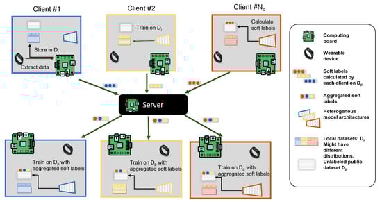 To distill the knowledge between clients, we need a shared dataset that has a distribution similar to the local datasets’ distributions that the clients are trying to collaboratively learn. In both datasets, 100 sample points from the train set were employed as a public dataset where they are shared between clients and used to calculate soft labels for knowledge distillation. In a real-world scenario, the public dataset is shared and broadcasted at the beginning of the FL processing by the server (e.g., fitness band company) as a medium for communication.