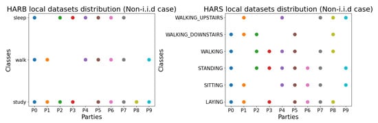 From left to right, the figures show the non-i.i.d distribution in the federated learning experiments of HARB and HARS datasets, respectively. Points show whether a party/client possesses a particular class in his local dataset or not. For example, in the HARS dataset, the party has three classes out of six. All clients are tested against all classes (The test dataset is the same for all parties). Each color in the scatter plot refers to a client.
