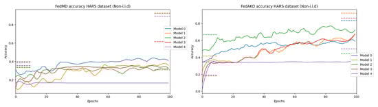 Ten heterogeneous models are trained in an FL setting using FedAKD (ours) and FedMD [26]. From left to right, the plots show five models (out of ten) trained collaboratively using FedAKD and FedMD, respectively, under the non-i.i.d case. It can be observed that models achieve better using our method. The five models shown here are the first five models in Table 4. The dashed line to the left and the right of each graph represent models’ performance on their local private dataset and models’ performance on all the local datasets combined, respectively. In all experiments, every client has 20 samples only per activity (as shown in Figure 6) as his , and . The lines are smoothed using the Sav–Gol filter to show the trend more clearly.