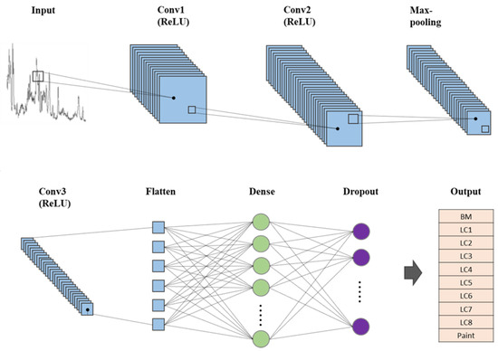 In recent years, the LIBS spectra analysis using convolution neural networks (CNN) has been attempted [11,12,13,14,15,16,17]. Chen et al. [11] adopted a CNN to classify rock samples. The results of the CNN were better than those of other methods, such as kNN, PCA-kNN, and SVM. Feng et al. [12] used the SVM, logistic regression (LR), and CNN to investigate rice leaf diseases. Cao et al. [13] and Castorena et al. [14] performed quantitative analysis of ChemCam (an instrument on the Mars rover Curiosity) spectral data using a CNN. Zhao et al. [15] employed a CNN to predict the brand of iron ore. Xing et al. [16] quantitatively analyzed LIBS data to determine lithium in brine samples. Huang et al. [17] adopted machine learning and CNN methods to identify adulterated milk powders. The use of LIBS spectra analysis with CNN is increasing; however, to the best of the authors’ knowledge, it has not been applied to evaluate the paint removal level using a high-power laser.