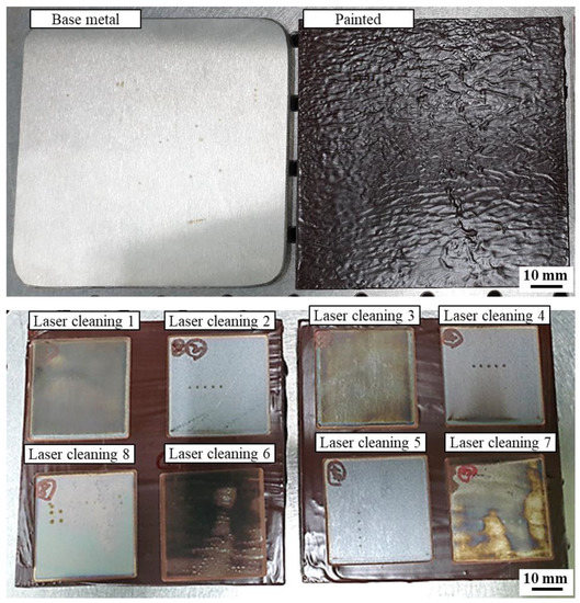 Images of the base metal, painted, and laser paint-cleaned specimens.