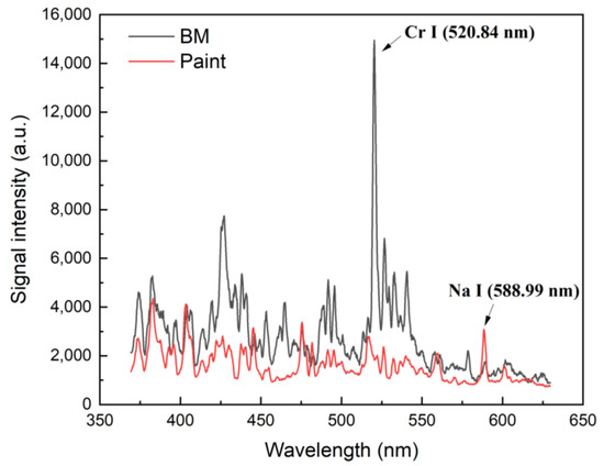 The LIBS analysis was employed to monitor the laser cleaning process. Figure 3 shows the LIBS spectra of the base metal (SS304L) and painted specimen. The major elements in SS304L were Fe, Cr, and Ni. In the spectral range of 370–630 nm, a strong Cr I (neutral atom) emission line appeared at 520.84 nm. For the painted specimen, a Na I emission line was detected with a distinguishable peak intensity at 588.99 nm compared to the base metal.