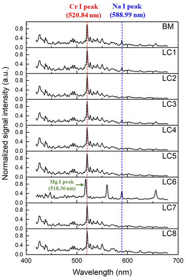 Figure 4 shows the normalized LIBS spectra of the base metal and the LC specimens. The LC6 shows a different LIB spectrum compared to the other specimens owing to significant paint residue on the surface. A relatively strong Na emission line was detected at 588.99 nm for the LC6. Moreover, a strong Mg I peak was detected at 518.36 nm next to a Cr emission line for the LC6. Meanwhile, specimens other than the LC6 showed significantly similar LIBS spectra. In addition, a small concentration of Na was detected in the BM, which may have been contaminated during sample preparation (e.g., fingerprints). These factors make the classification of the LIBS spectrum more difficult. Therefore, the classification of the LIBS spectrum requires additional complex peak analyses, including background removal, peak intensity or peak area calculation, and peak intensity ratio calculation, for high accuracy and rapid analysis.