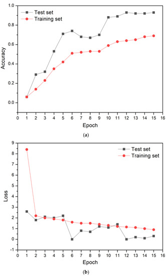 The learning (a) accuracy and (b) loss of the CNN model for 15 epochs.
