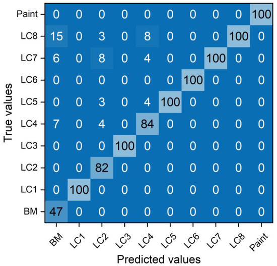 All spectral data were converted into image files by removing the layers, scales, grids, and labels. The developed CNN model was trained by repeating 15 and 20 learning times (i.e., epochs). Figure 5 shows the learning accuracy and loss of the CNN model after 15 epochs. Learning accuracy represents the number of prediction errors for the entire dataset. The loss is the difference between the true and predicted values (calculated using the CNN model). The learning accuracy and loss were 93% and 0.3 after 15 epochs. The performance of the CNN model can be evaluated with the accuracy of the test set. Therefore, the test set were used to evaluate the performance of the CNN model after the completion of training process. Figure 6 shows the confusion matrix after 15 epochs. If the true and predicted values are equivalent, it can be considered to have high learning accuracy. In other words, the CNN model can accurately classify BM, painted, and LC specimens. The painted, LC1, LC3, LC5, LC6, LC7, and LC8 showed 100% agreement between the true and predicted values.